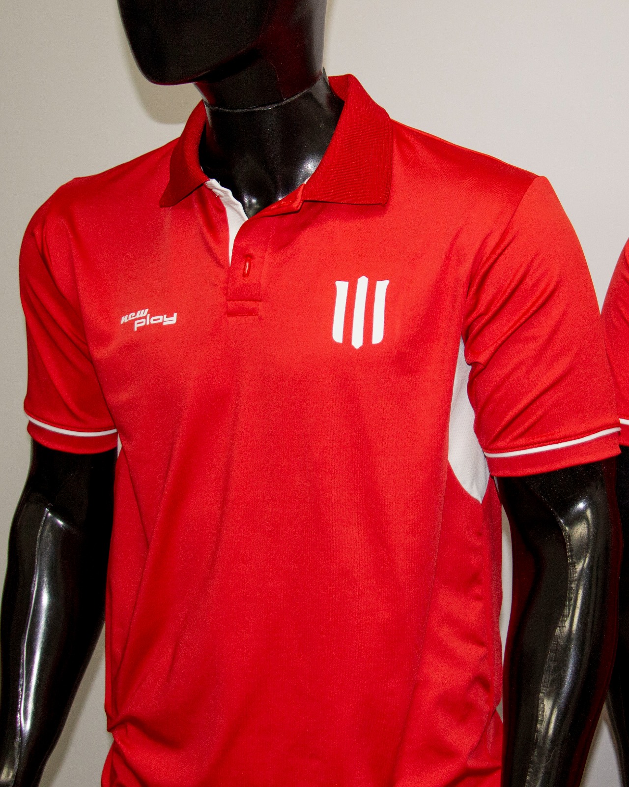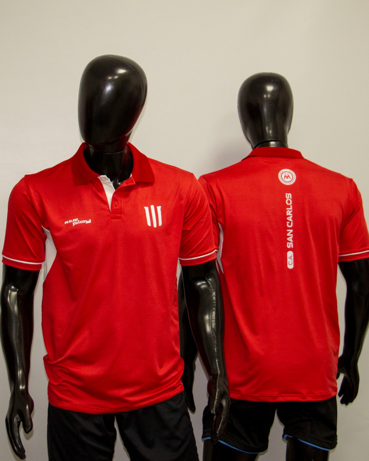 Chombas deportivas de policam rojas con estampas cuello tejido puño con vivo blanco