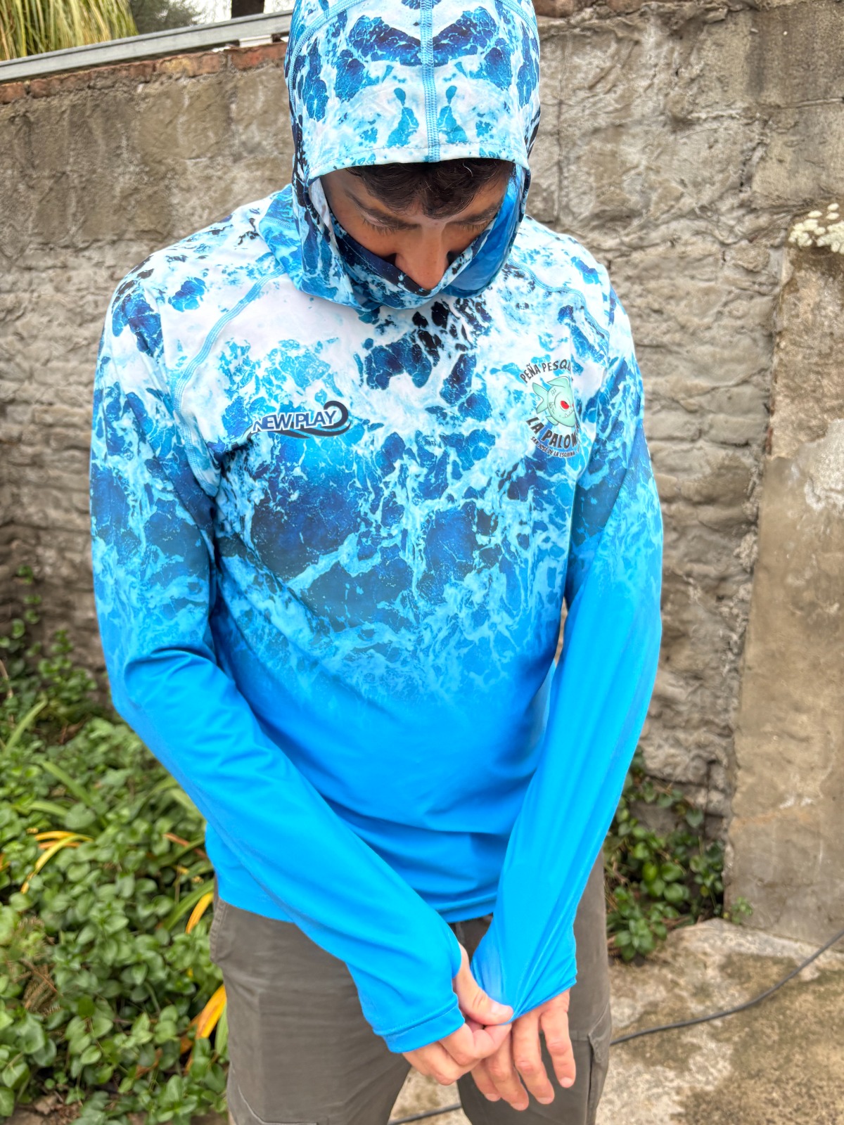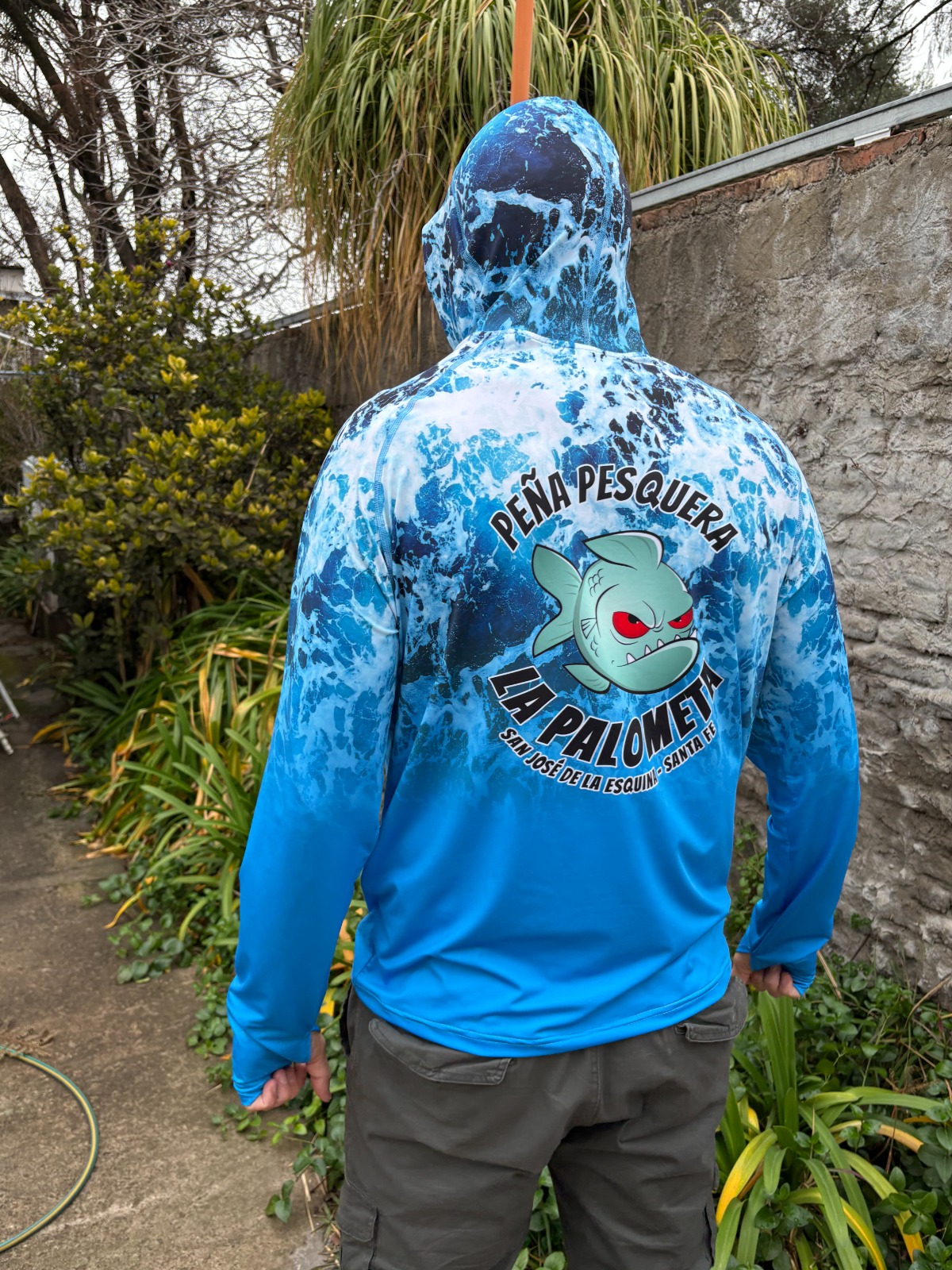 Remeras de pesca 100% sublimadas, proteccion UV, secado rapido, con capucha y buff incorporado, puños con ojal