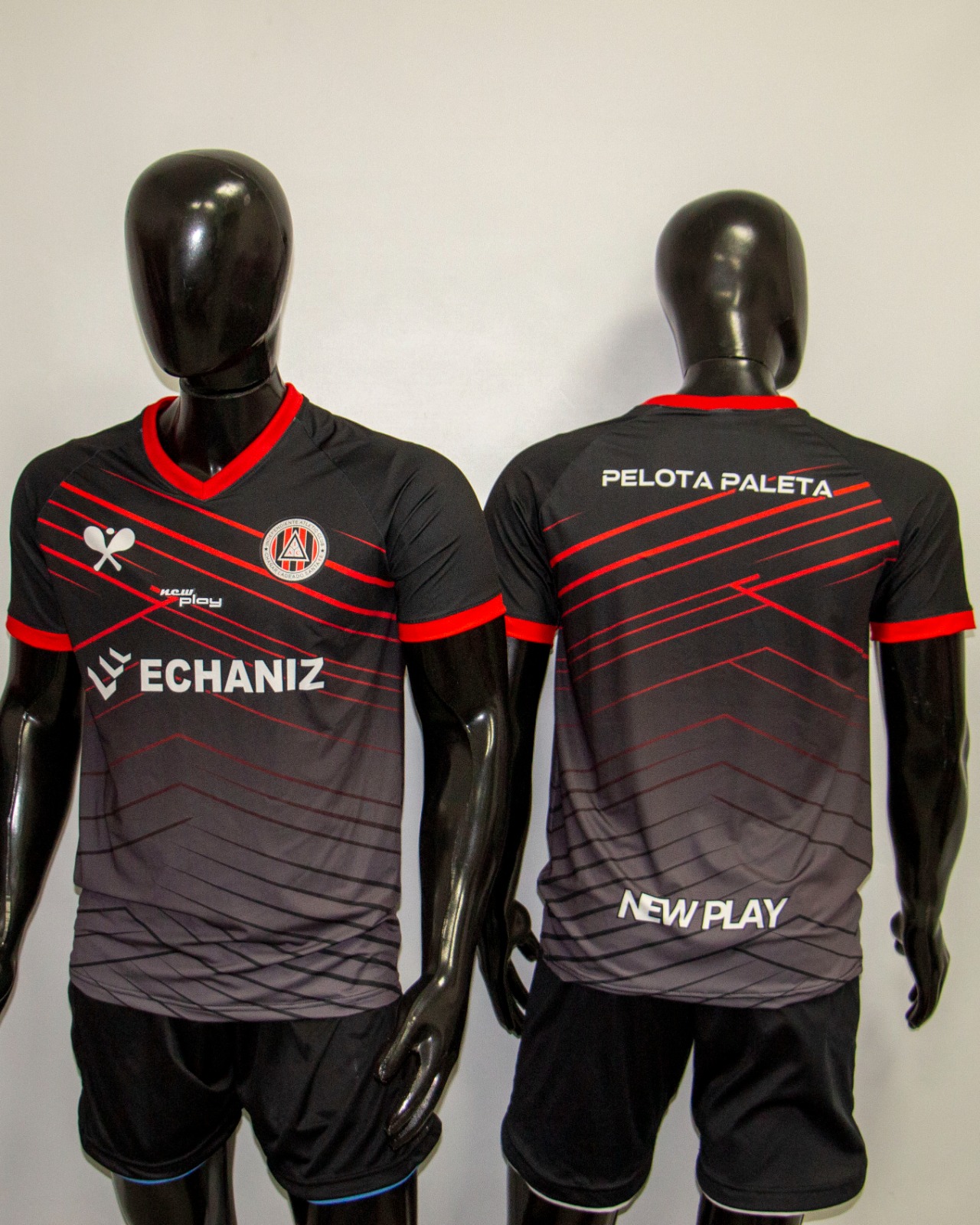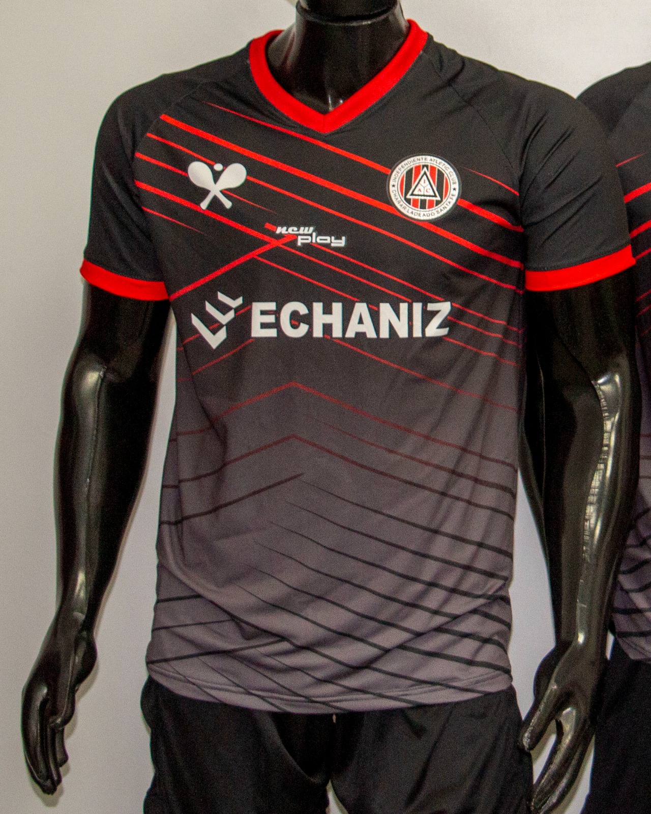 REMERAS UNISEX CUELLO EN V PARA PADEL DE POLICAM SUBLIMADO, CUELLO Y PUÑO ROJO